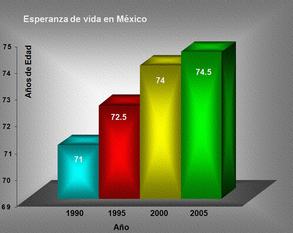 En el año de 1990, una mujer vivía en promedio 71 años. Actualmente, de acuerdo al último censo demográfico, una mujer vive en promedio 74.5 años.