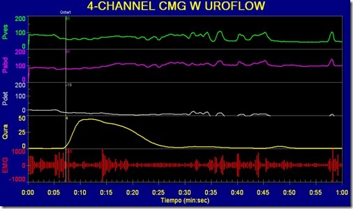 En la imagen se puede apreciar algunas de las gráficas que se obtienen durante la realización del ”estudio urodinámico”.